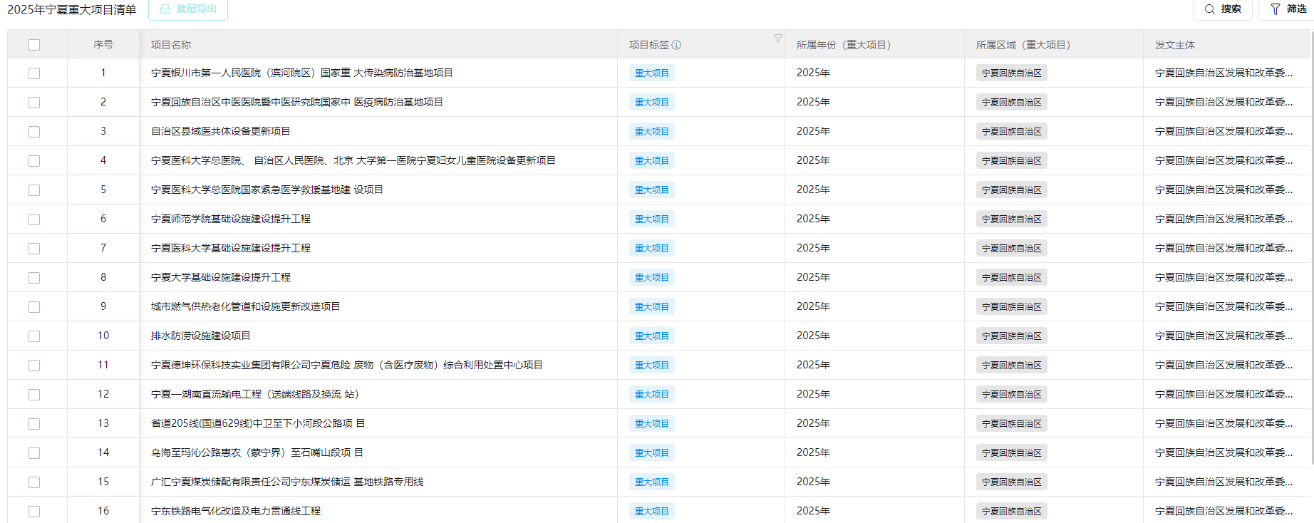 查询政府官方发布的重大项目清单和规划。整合宁夏回族自治区(包含地级市)2025重大项目,含标准化项目清单及明细。