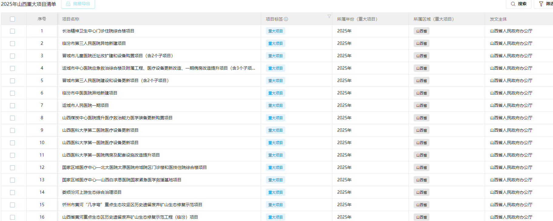 查询政府官方发布的重大项目清单和规划。整合山西省(包含地级市)2025重大项目,含标准化项目清单及明细。