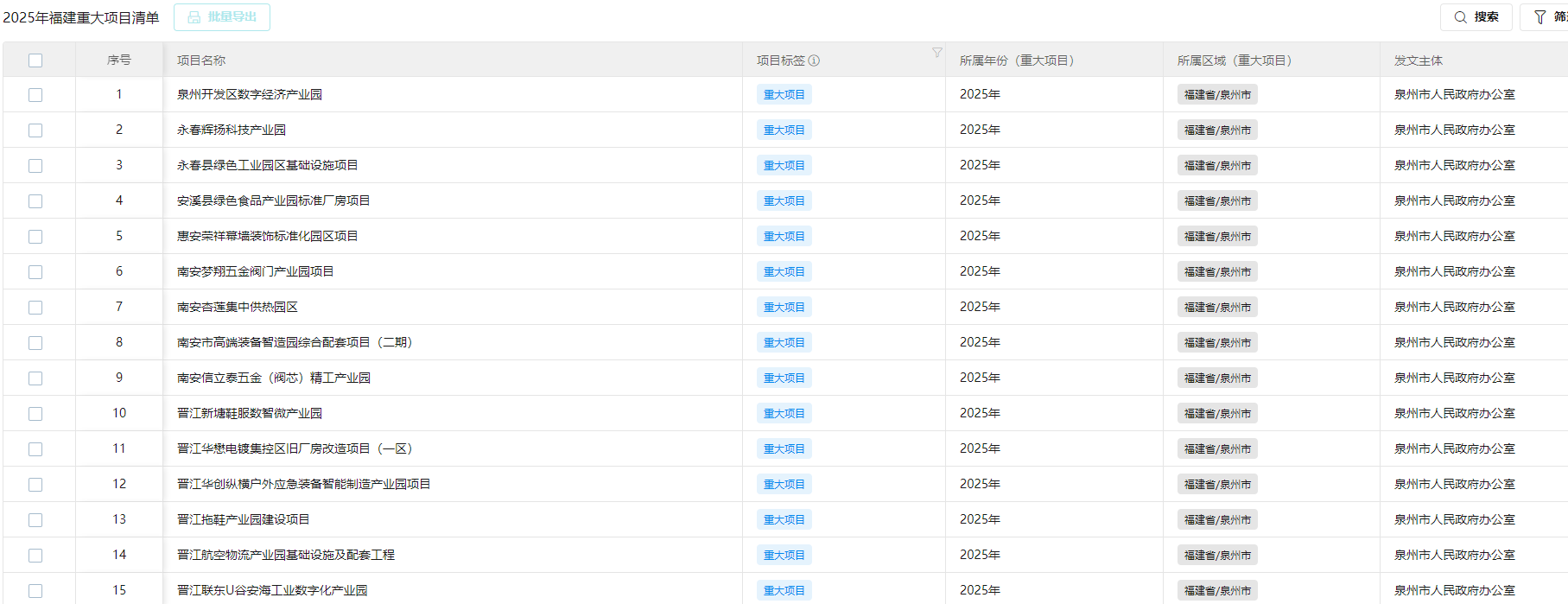 查询政府官方发布的重大项目清单和规划。整合福建省(包含地级市)2025重大项目,含标准化项目清单及明细。