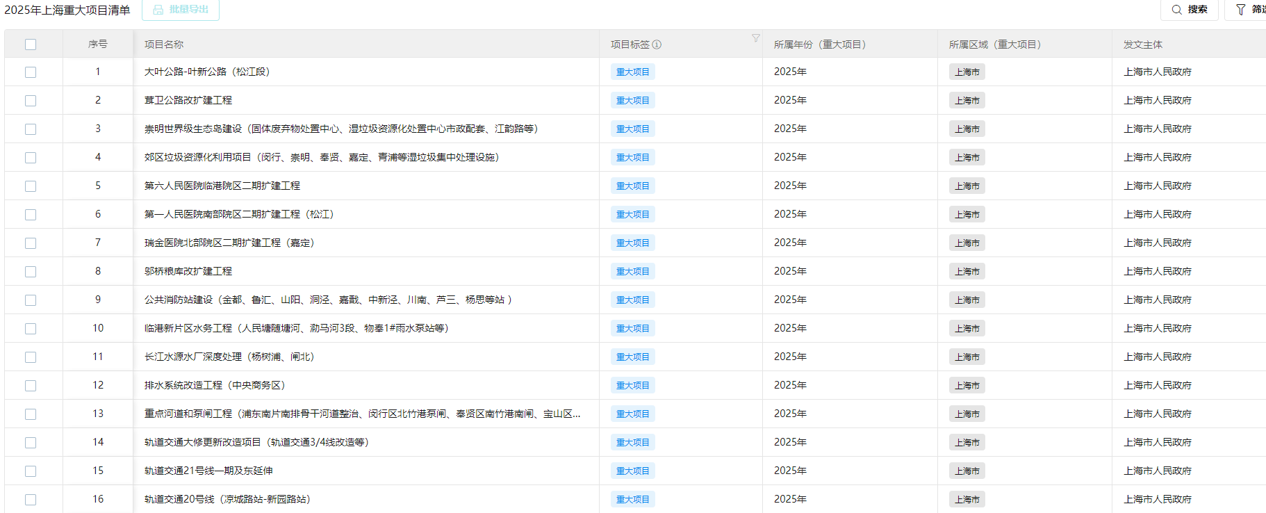 查询政府官方发布的重大项目清单和规划。整合上海市2025重大项目,含标准化项目清单及明细。