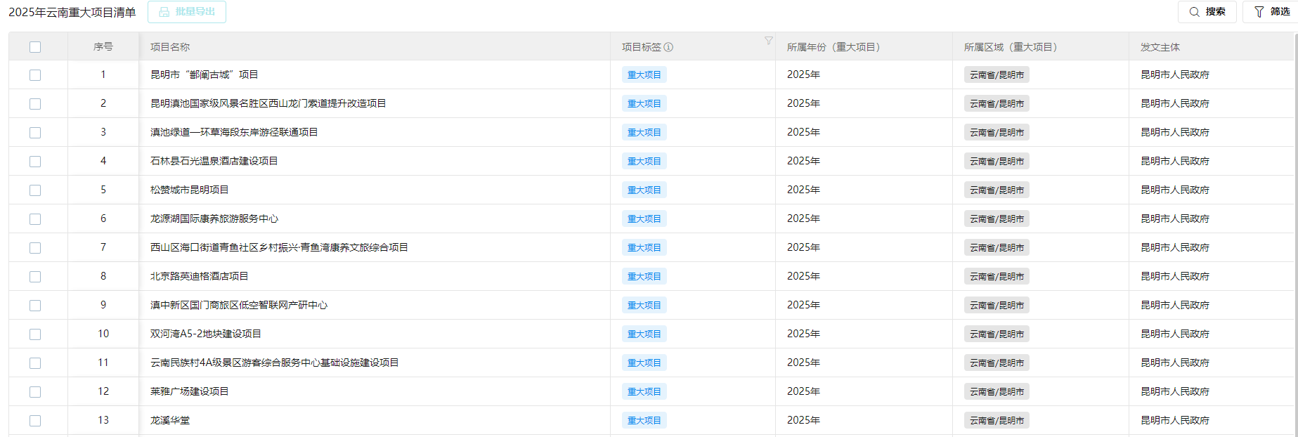 查询政府官方发布的重大项目清单和规划。整合云南省(包含地级市)2025重大项目,含标准化项目清单及明细。